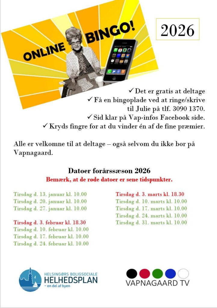 Spil bingo med dine naboer hjemme fra sofaen. Vær med til Online Bingo hver onsdag – det er gratis og der er fine præmier. Bingopladen får du ved at kontakte